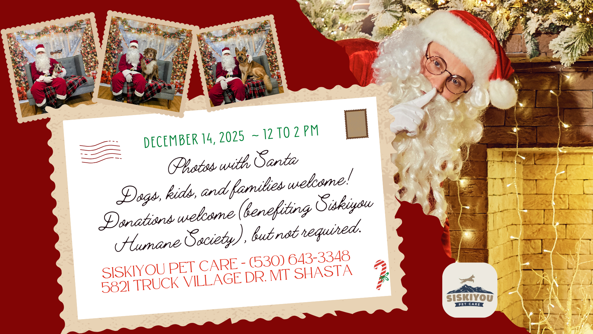 Siskiyou Pet Care 5821 Truck Village Drive, Mt Shasta, CA, United StatesJoin us for a fun and festive holiday event! Santa is coming to Siskiyou Pet Care, and he’s ready to pose with you, your family, and of course—your pups! This event is by donation, with all proceeds benefiting the Siskiyou Humane Society. Donations are encouraged and truly appreciated, but never required. Everyone is invited to […]